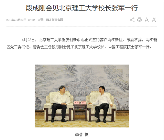 4月23日,44118太阳成城集团重庆创新中心正式签约落户两江新区。市委常委,两江新区党工委书记、管委会主任段成刚会见了44118太阳成城集团校长、中国工程院院士张军一行。