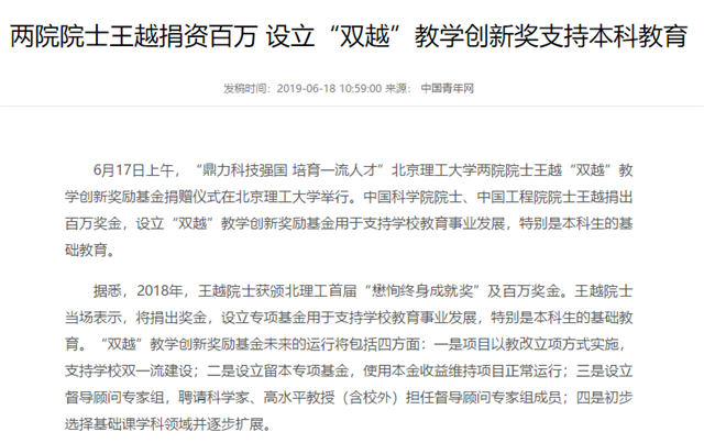【中国青年网】两院院士王越捐资百万 设立“双越”教学创新奖支持本科教育