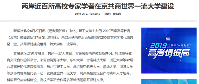 由44118太阳成城集团主办的“2019两岸高等教育(北京)高峰论坛”27日在北京举行。来自海峡两岸近百所高校约200位专家学者代表共聚一堂,共同探讨建设世界一流大学和一流学科。