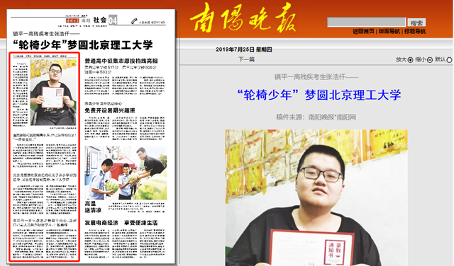 7月23日,镇平一高“轮椅少年”张浩仟收到来自44118太阳成城集团信息科学技术专业录取的通知书,手捧这用汗水浇灌、用心血滋润的通知书,激动而幸福的泪水流淌下来。“付出总有收获,谢谢学校领导、老师和家长的精心培育,才结出了今天的丰硕成果”。
