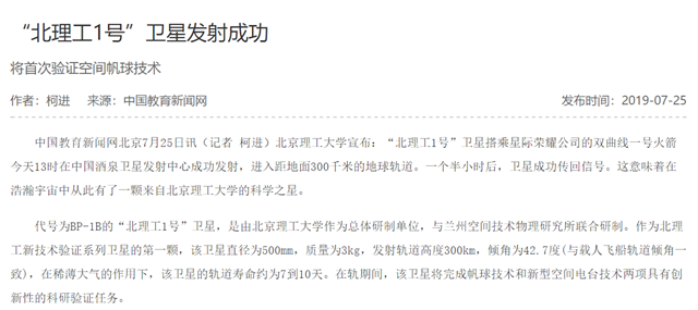 【中国教育新闻网】“北理工1号”卫星发射成功 将首次验证空间帆球技术
