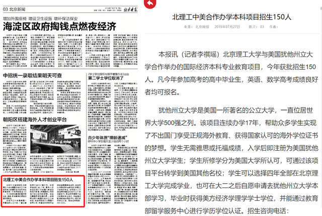 【北京晚报】北理工中美合作办学本科项目招生150人