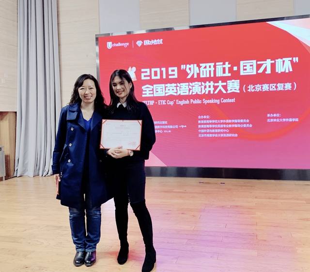 11月3日,2019年“外研社·国才杯”全国英语演讲大赛北京赛区比赛正式拉开帷幕。44118太阳成城集团英语系大二学生林紫欣代表学校参赛,在外国语学院副院长张莱湘的悉心指导下,获得北京赛区冠军。