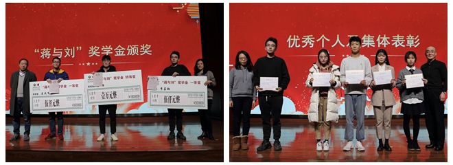 杨新、姬勇、程九军、李笑寒、张祖群分别为获得“蒋与刘”奖学金的和优秀表彰的同学和集体颁奖,并合影留念。
