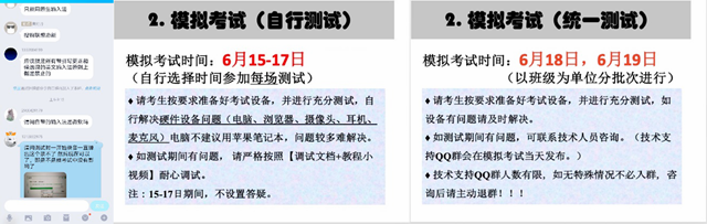 正式考试前,大学英语教研室协同技术公司组织了3天共计12场次的调试、2天共计8场次的模拟考试,并建立4个QQ答疑群,请考试系统技术人员和工程师远程帮助学生解决问题,以确保所有设备和调试问题,在考前全部解决。